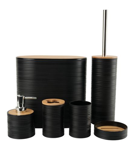 סט אביזרי אמבטיה מעוצב ומרשים, המשלב גימור שחור מט עם פרטים דמויי עץ חמים, ליצירת מראה יוקרתי, מודרני ואחיד בחדר הרחצה או השירותים.