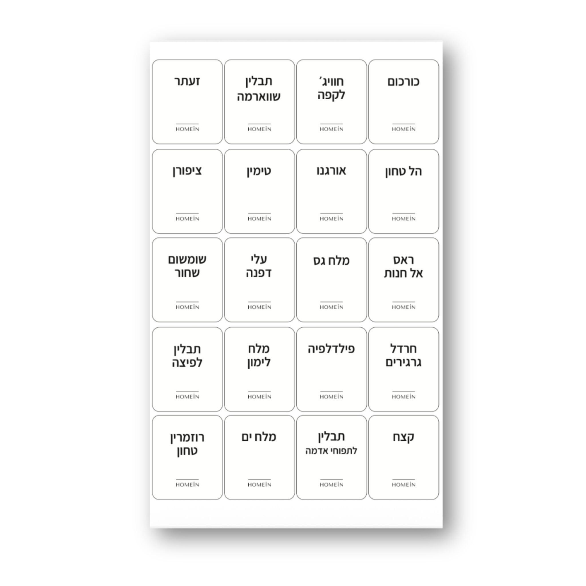 סט מדבקות תבלינים בעיצוב נקי ומינימליסטי, מושלם לסידור וארגון מגירת התבלינים או מדף המטבח בצורה אסתטית וברורה.